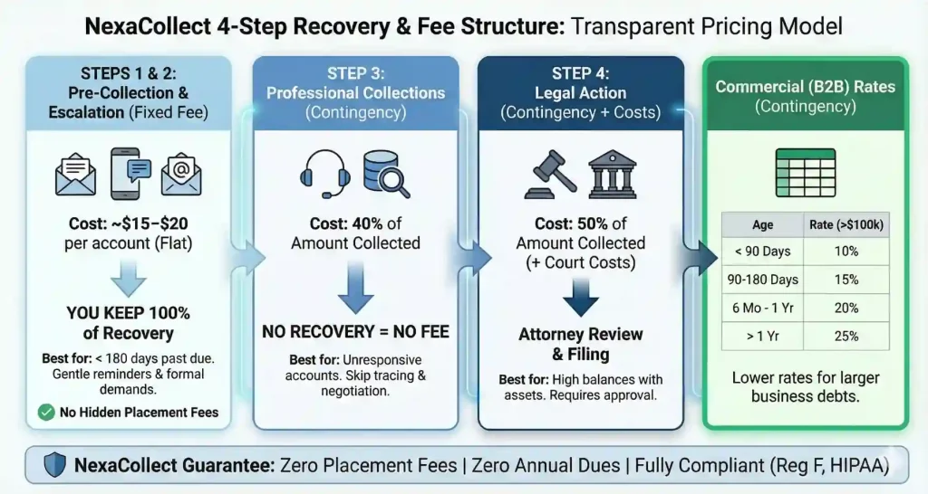 We have dismantled the traditional, high-commission collection model and replaced it with a 4-Step Recovery System that scales with your specific needs.